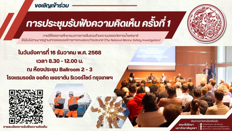 ขอเชิญเข้าร่วมงานสัมมนารับฟังความคิดเห็นจากหน่วยงานในสังกัดกระทรวงคมนาคมและหน่วยงานอื่นที่เกี่ยวข้องภายใต้โครงการศึกษาแนวทางการสืบสวนด้านความปลอดภัยทางน้ำแห่งชาติให้เป็นไปตามมาตรฐานสากลขององค์การทางทะเลระหว่างประเทศ (The National Marine Safety Investigation)